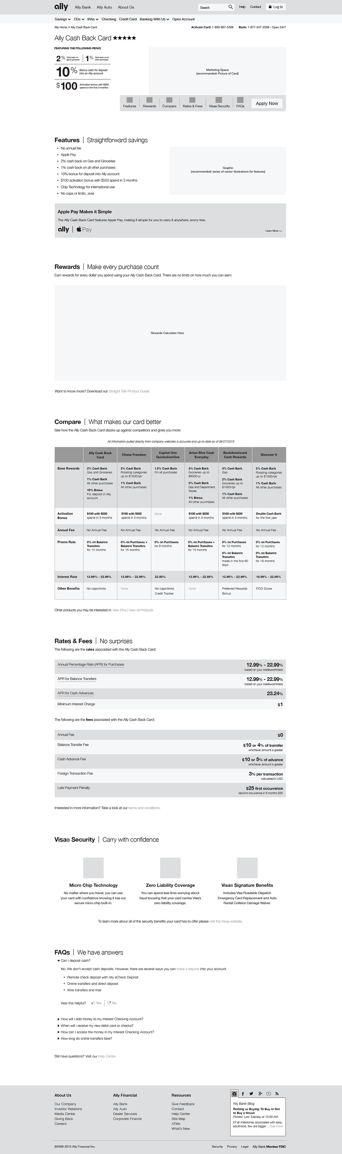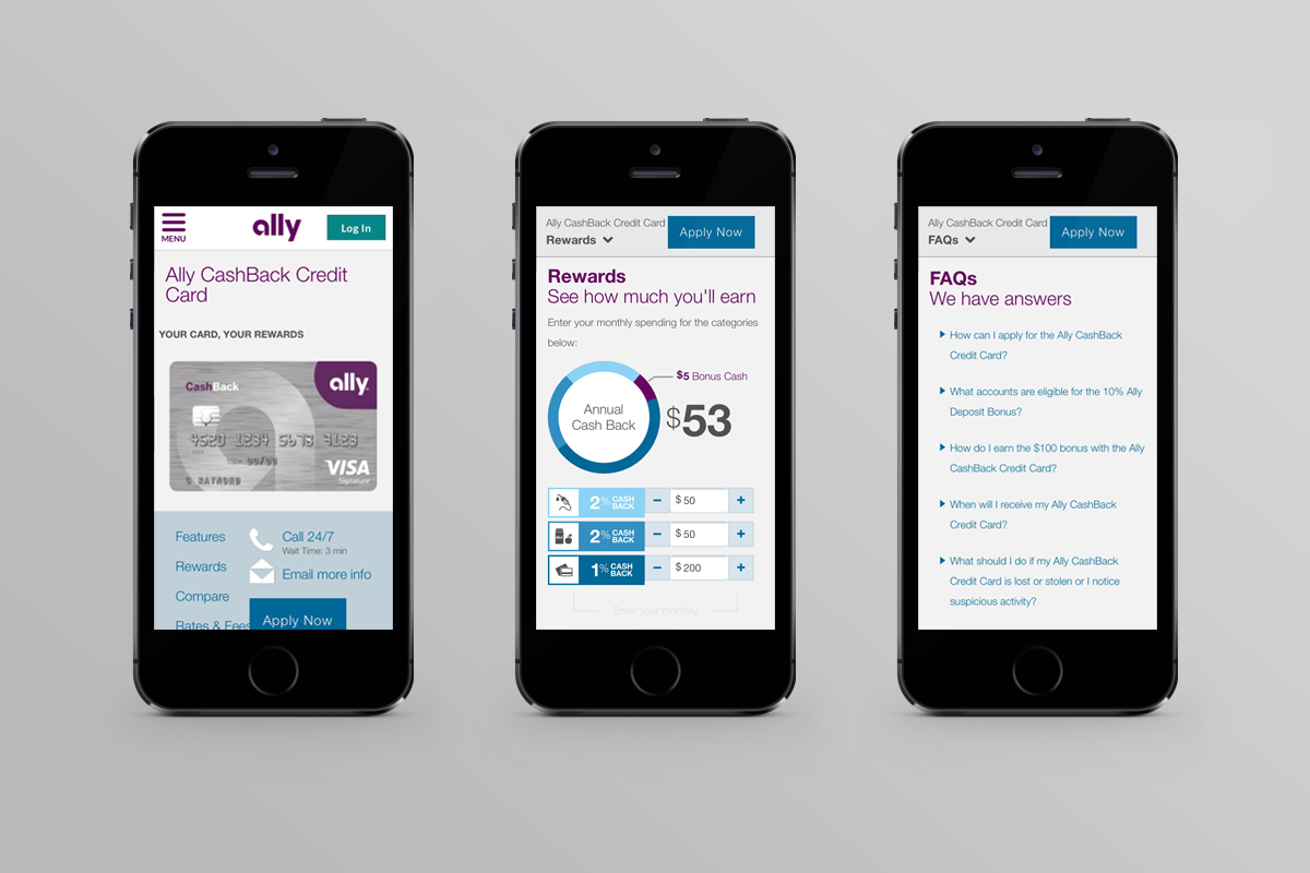 The largest project I worked on in my time at Ally revolved around designing and building a product page for the release of their first ever credit card in partnership with TD Bank. The design needed to be responsive, include some sort of rewards calculator, and the content on the page would need to be determined by a competitive audit since there was no precedent to go off of internally. For this project I worked with a small team of three that consisted of an Information Architect, a Content Strategist, and a Project Manager.