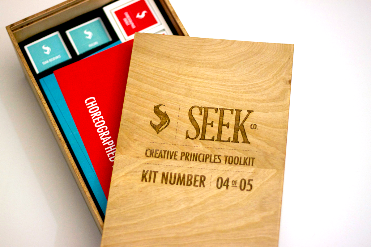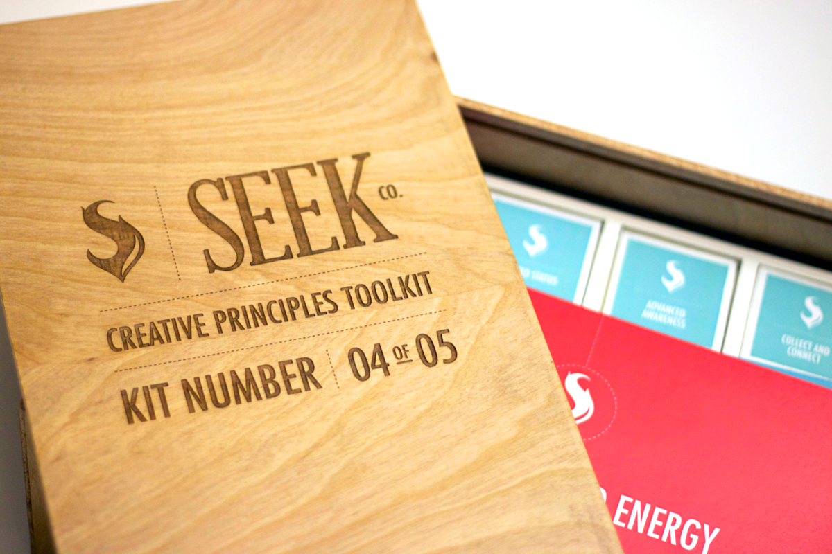 I designed this toolkit to serve as a visual representation of Seek’s proposal process for potential clients. It consists of a wooden tray with five slots and ten tiles. The tiles for Seek’s two, consistent principles are glued into their slots while the other eight can then be mixed and matched to create a unique approach to each client’s project. Additionally, each kit contained a small deck of ten cards that gave an overview of what each principle meant and how it was meant to function. These cards included a QR code to download a digital version of the toolkit along with some examples of past case studies.