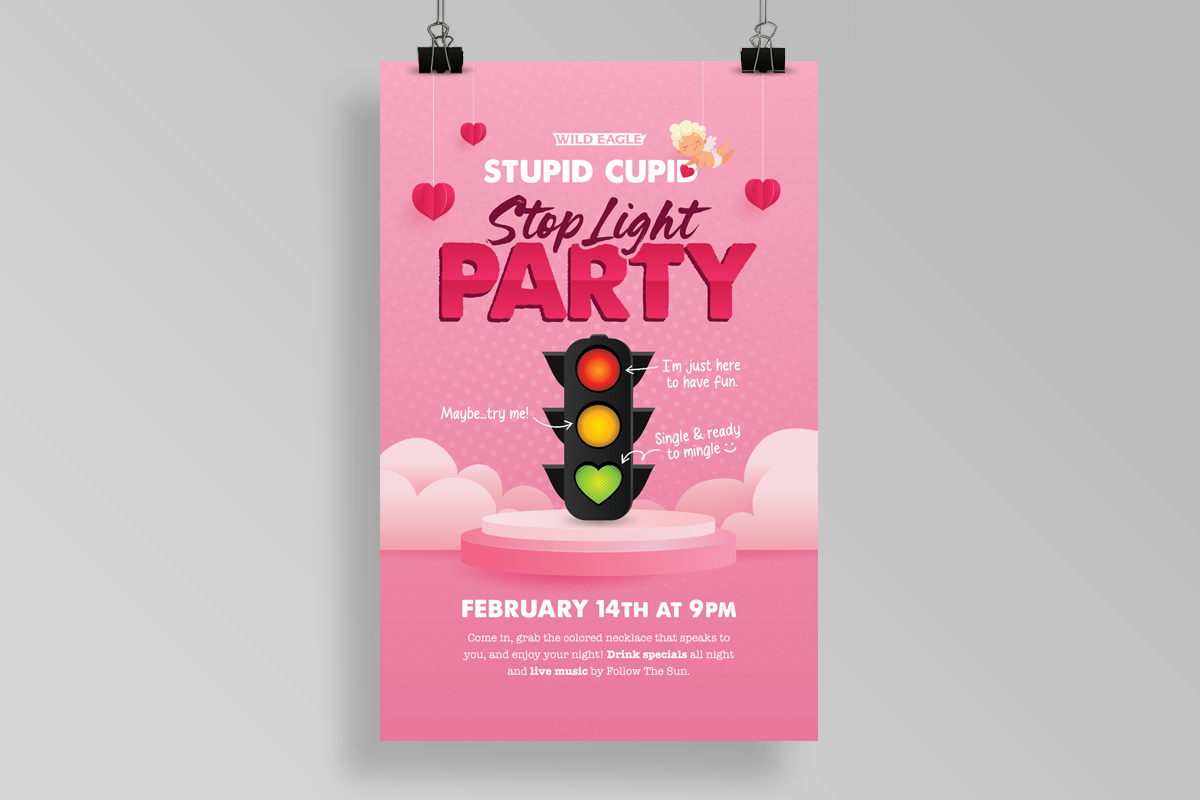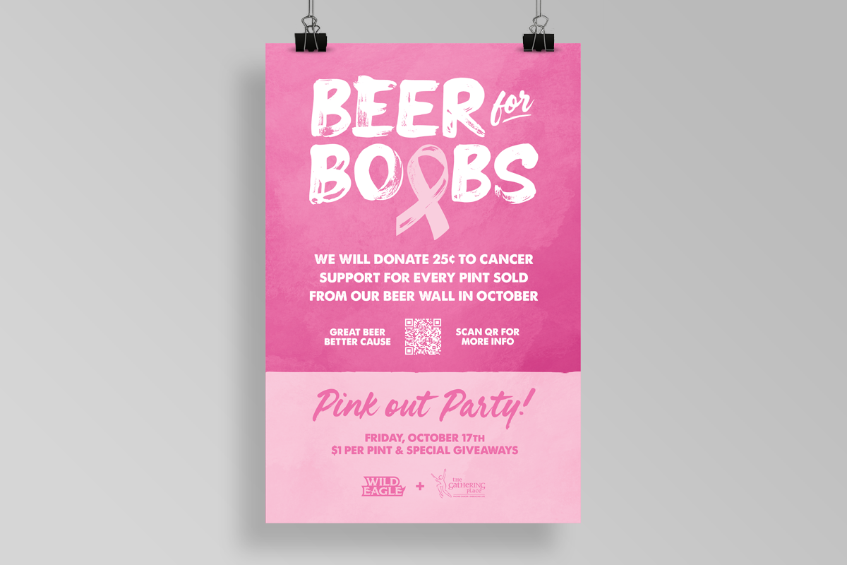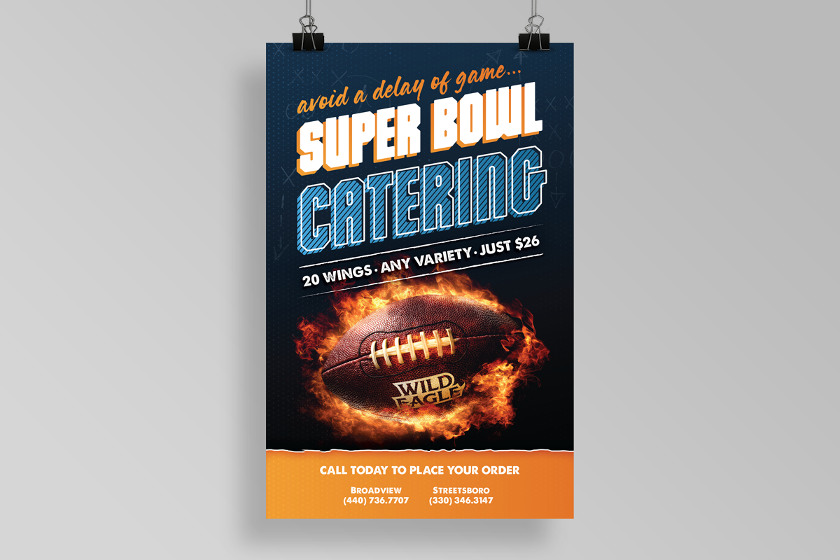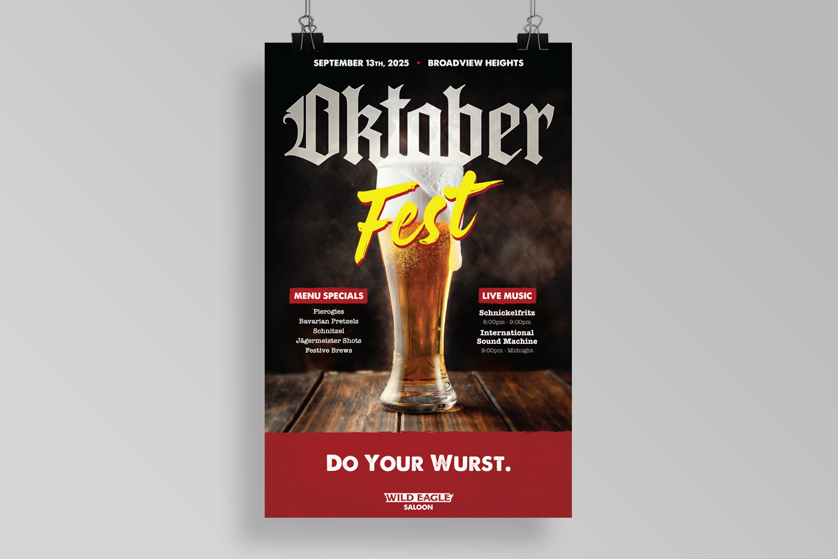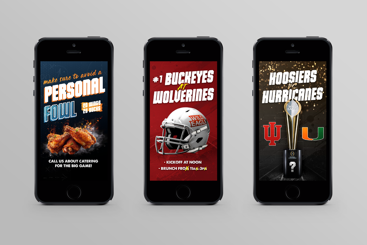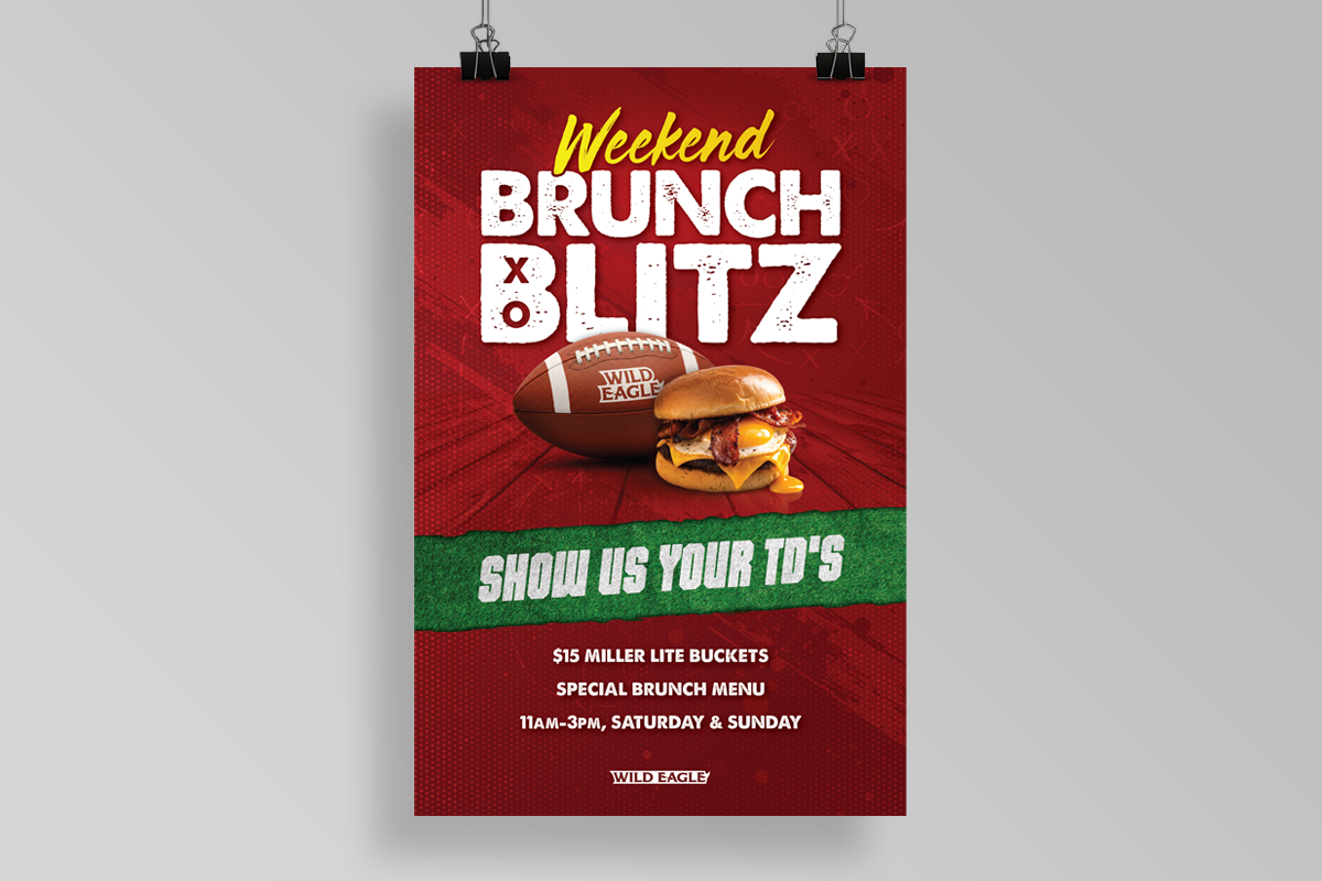 I have worked on several ad campaigns and event promos for the Wild Eagle Saloon ranging from special menu offerings during the football season to single event watch parties. Generally, for the longer campaigns, I develop a specific brand identity for that campaign complete with a logo mark, unique fonts, colors, etc. while ensuring that this fits under the larger umbrella of Wild Eagle’s primary brand identity. The deliverables for campaigns and events are very similar and usually include a physical poster that hangs on the wall, some table top cards, and a variety of auxiliary social media assets that can be used to promote the event across various channels.